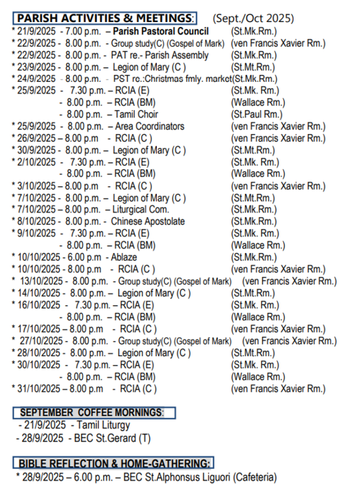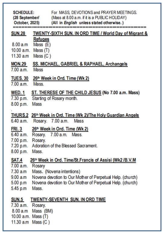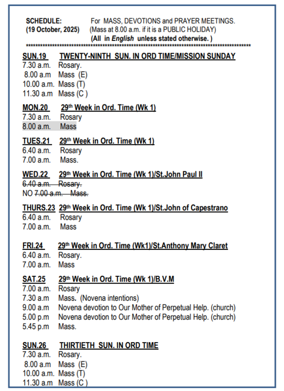 SCHEDULE FOR OCTOBER MONTH OF ROSARY