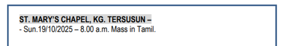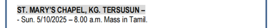 Dormitory St.Anne, Bukit Mertajam. Church of St.Anthony, Nibong Tebal | May 24/25 Aug 23/24 Nov 15/16 |