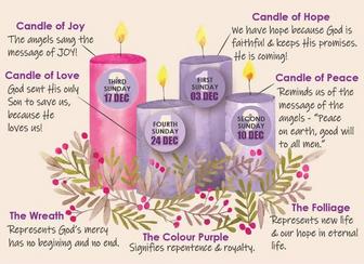 Advent: Advent comes from the Latin word meaning "coming." Jesus is coming, and Advent is intended to be a season of preparation for His arrival. While we typically regard Advent as a joyous season, it is also intended to be a period of preparation, much like Lent. Prayer, penance and fasting are appropriate during this season.